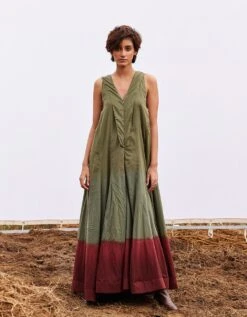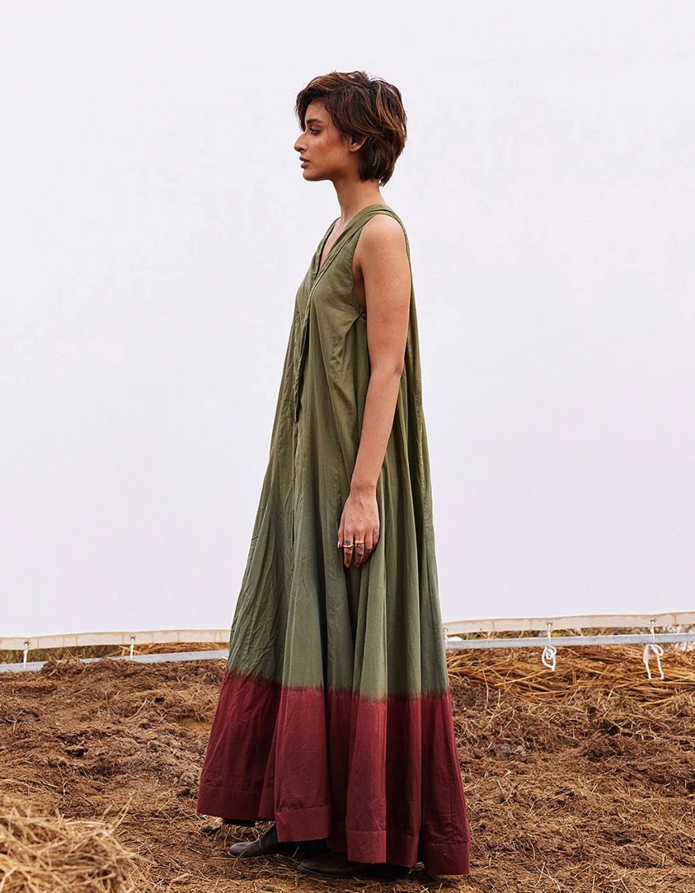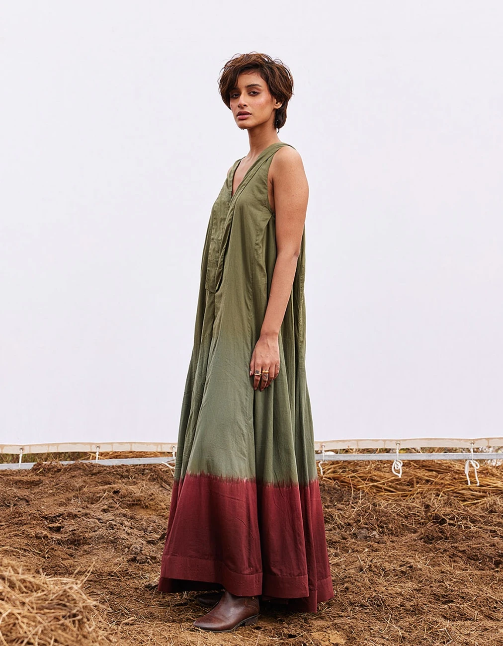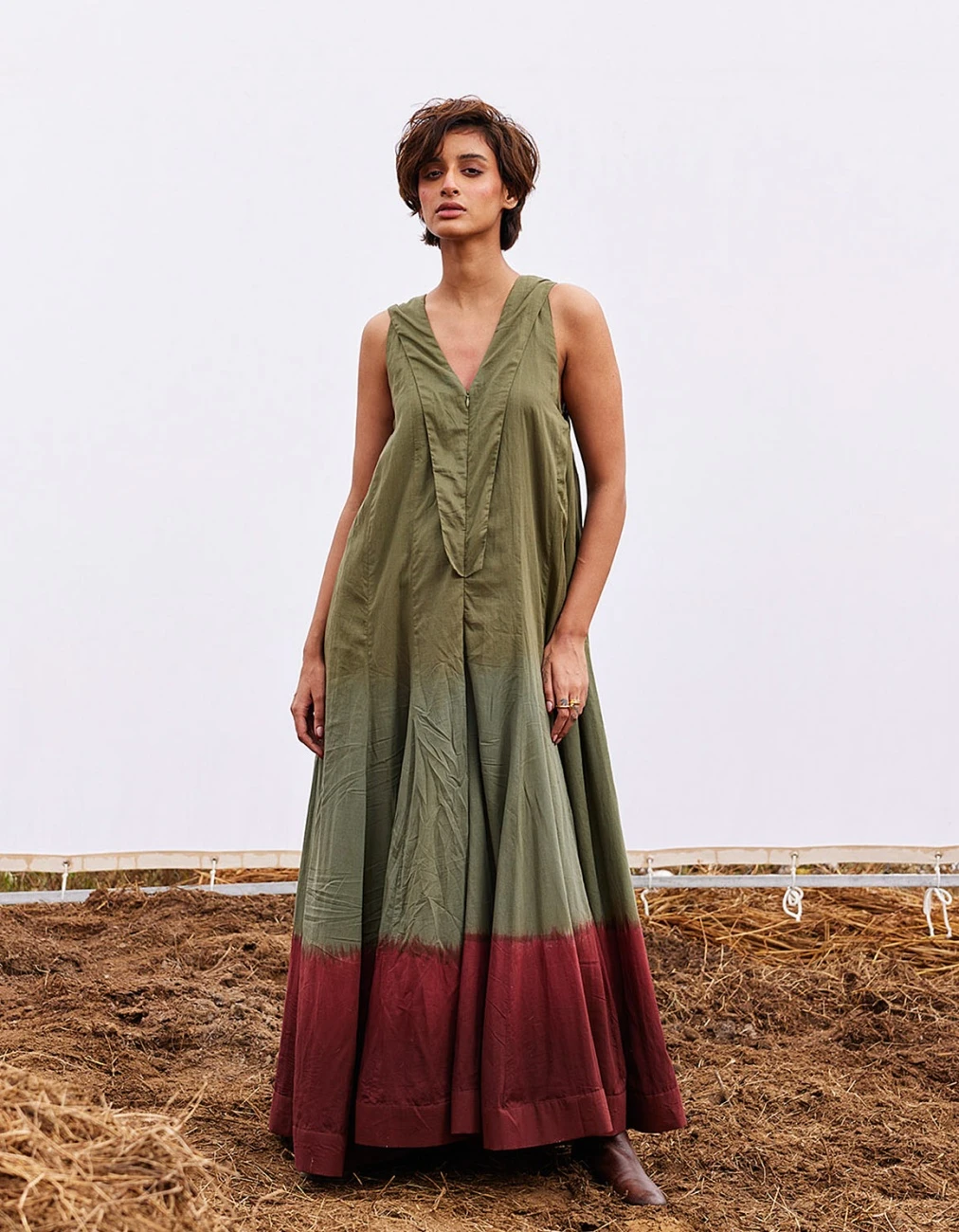- Featuring a sage green mul jumpsuit with a front zip opening, v neckline, side pleats and dip dyed hemline