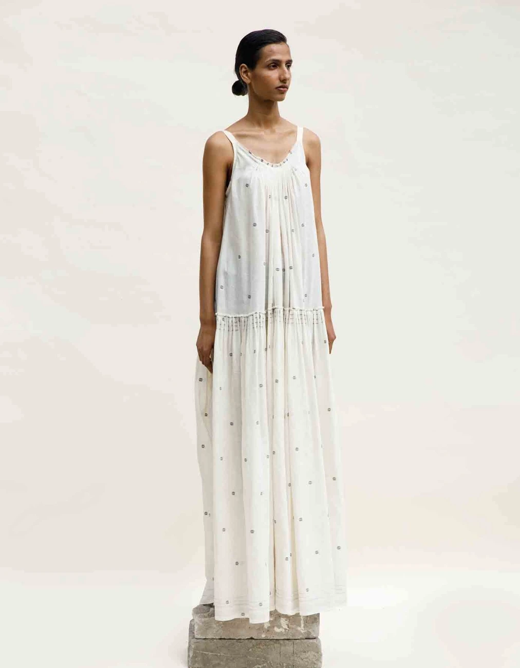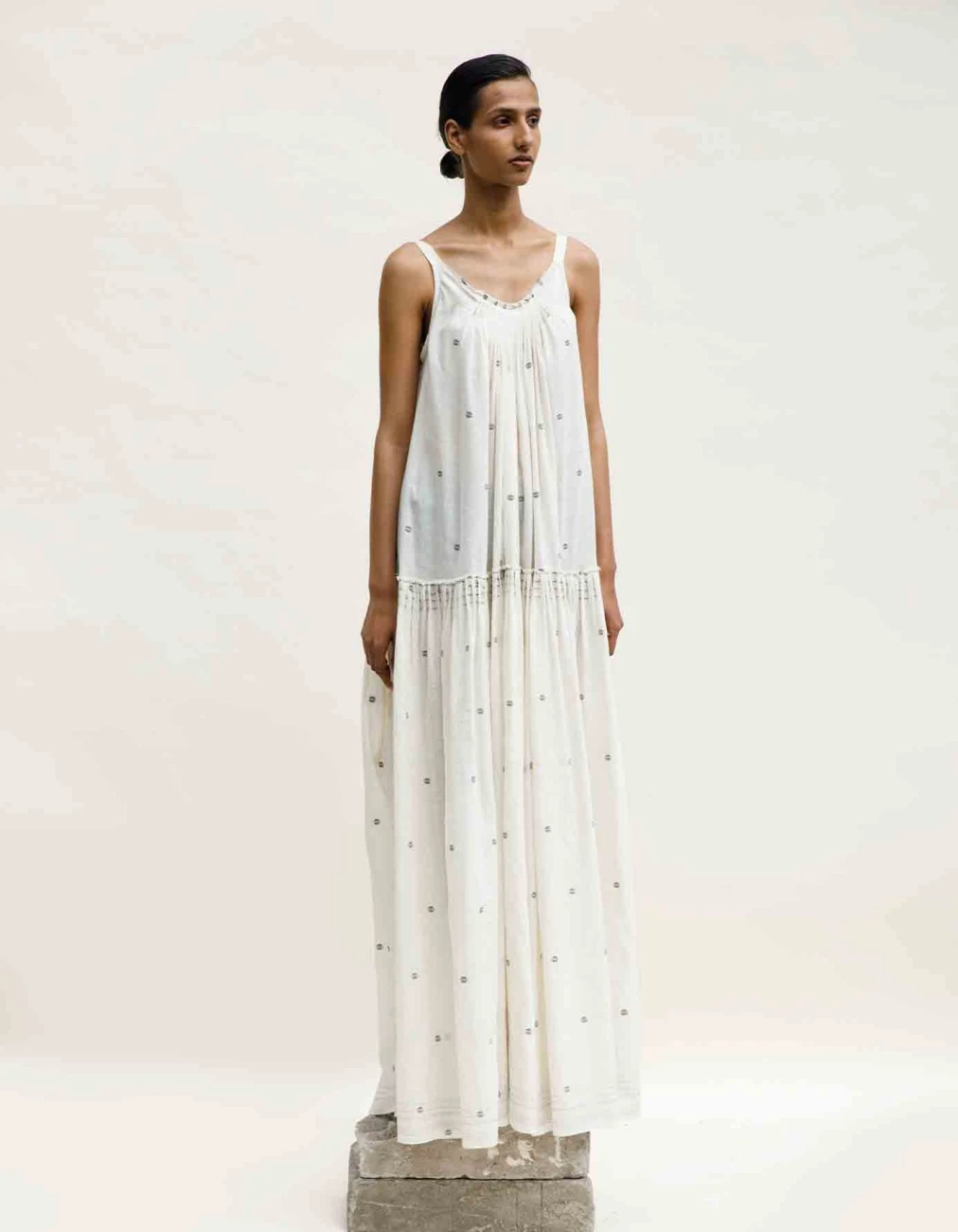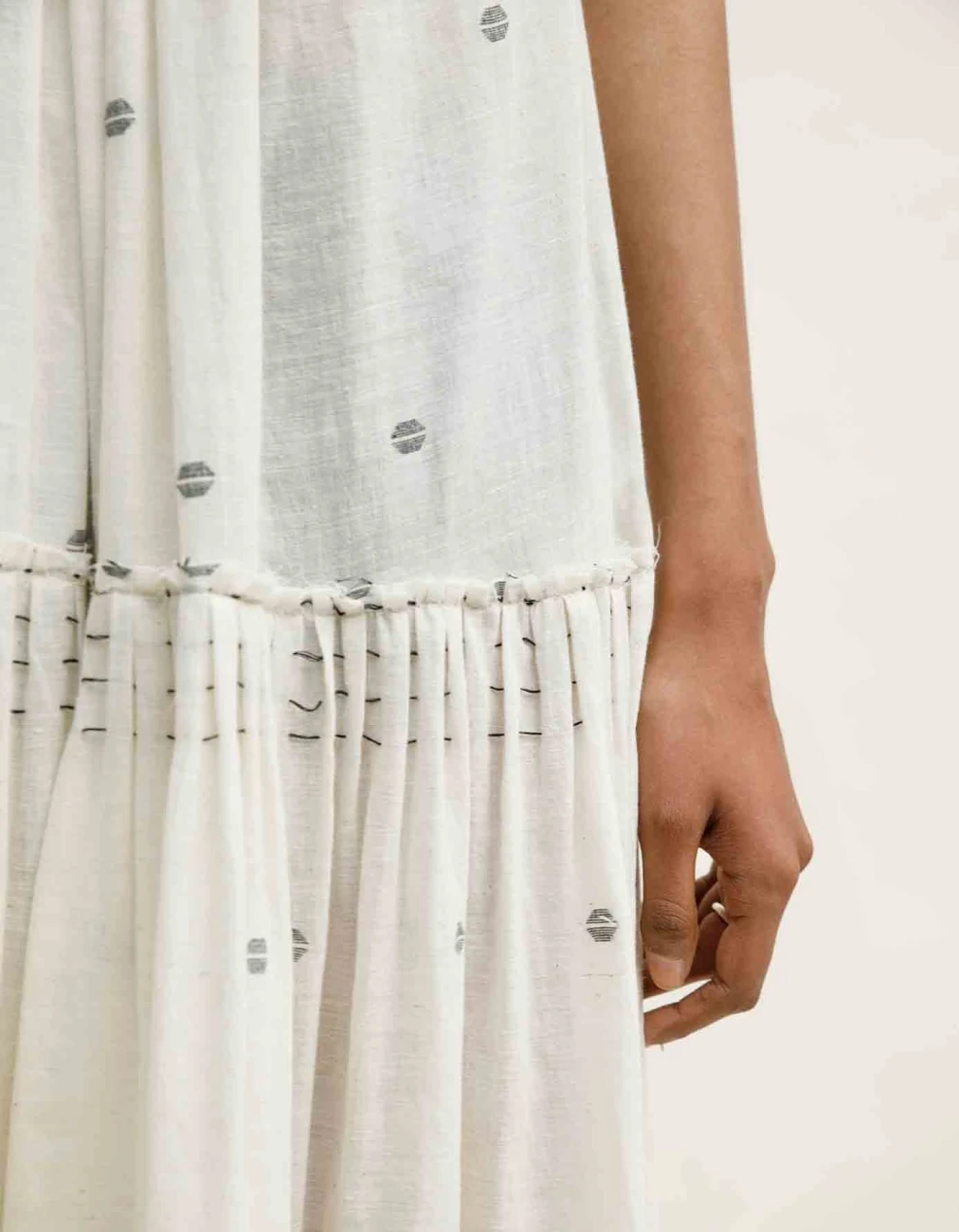 - Flared jamdani tent dress with deep back in handloom cotton-linen