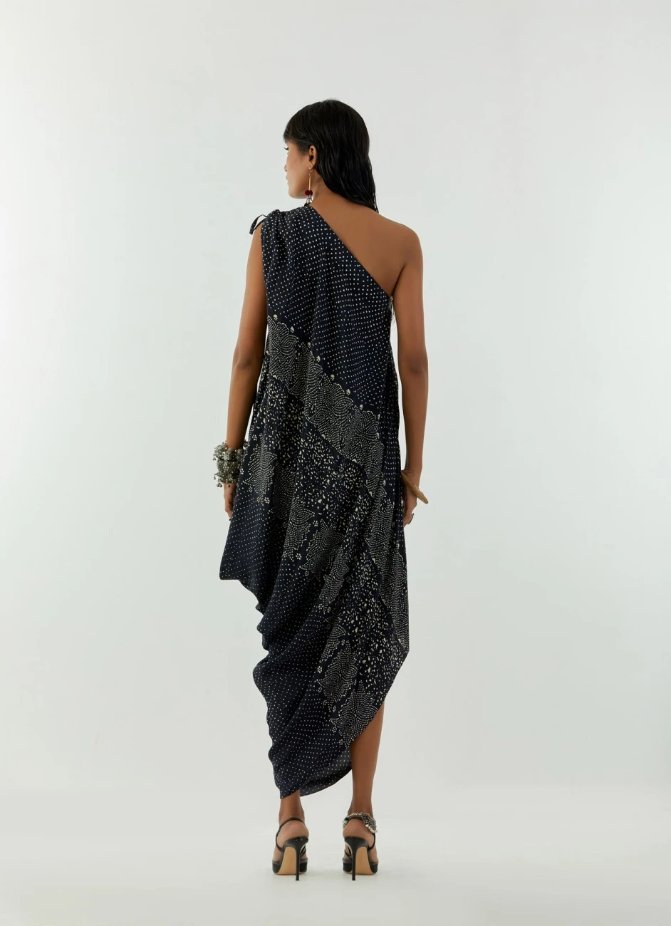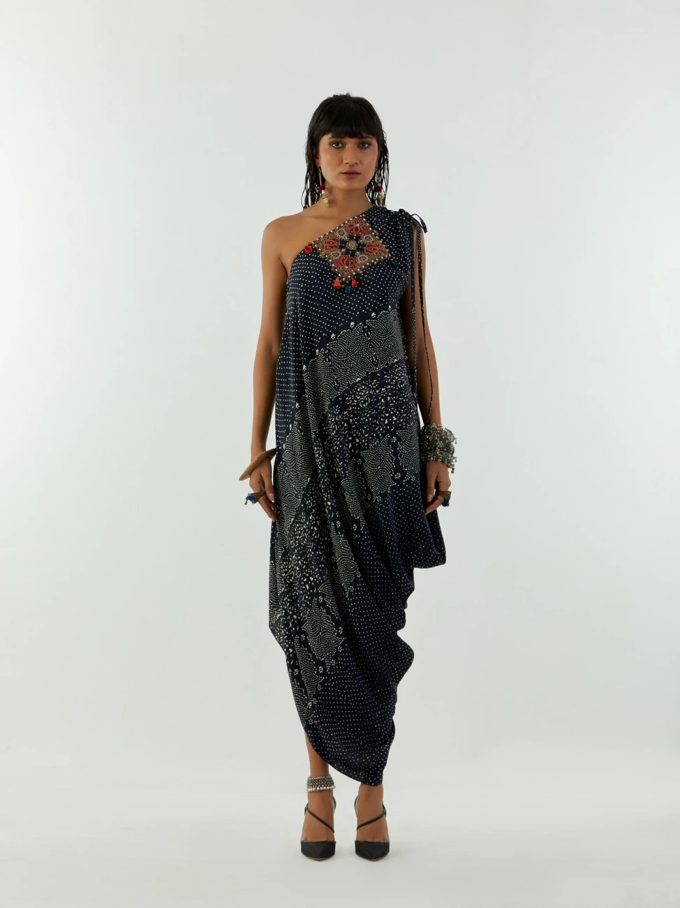 - Texture print one shoulder drape dress with embroidery patch on neck and tribal tassel detailing