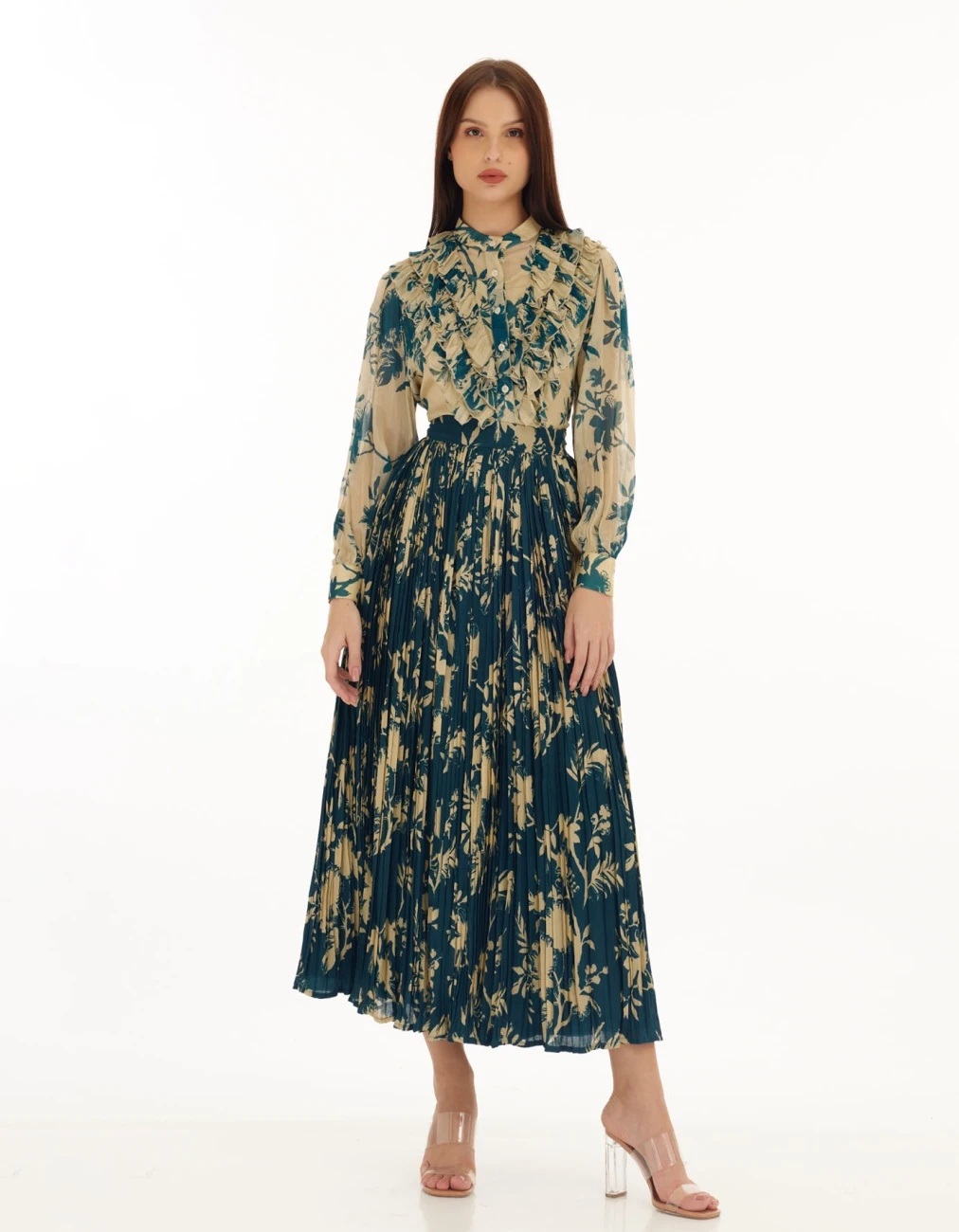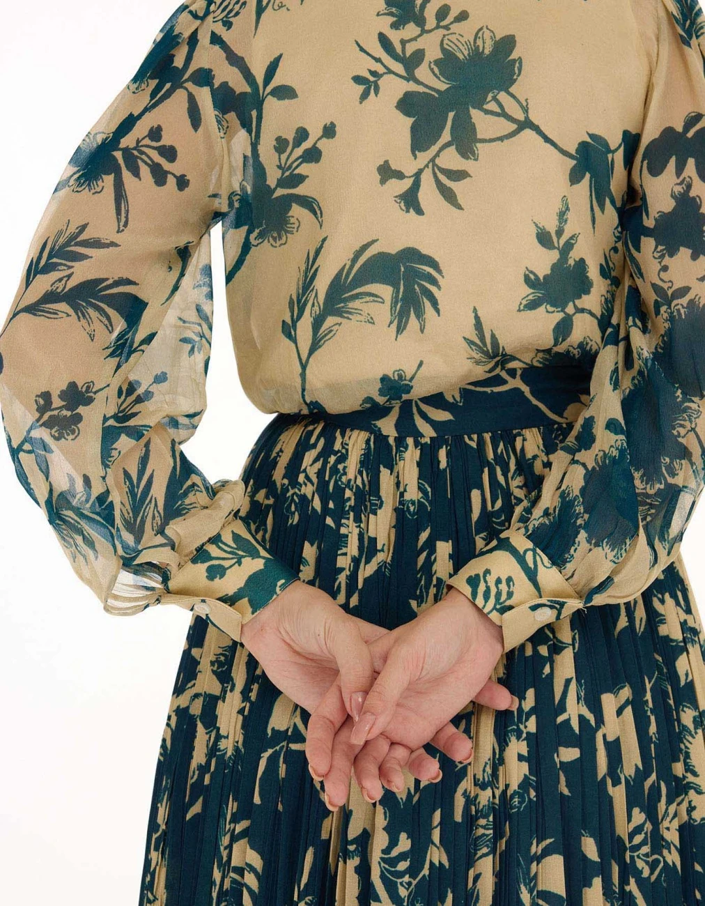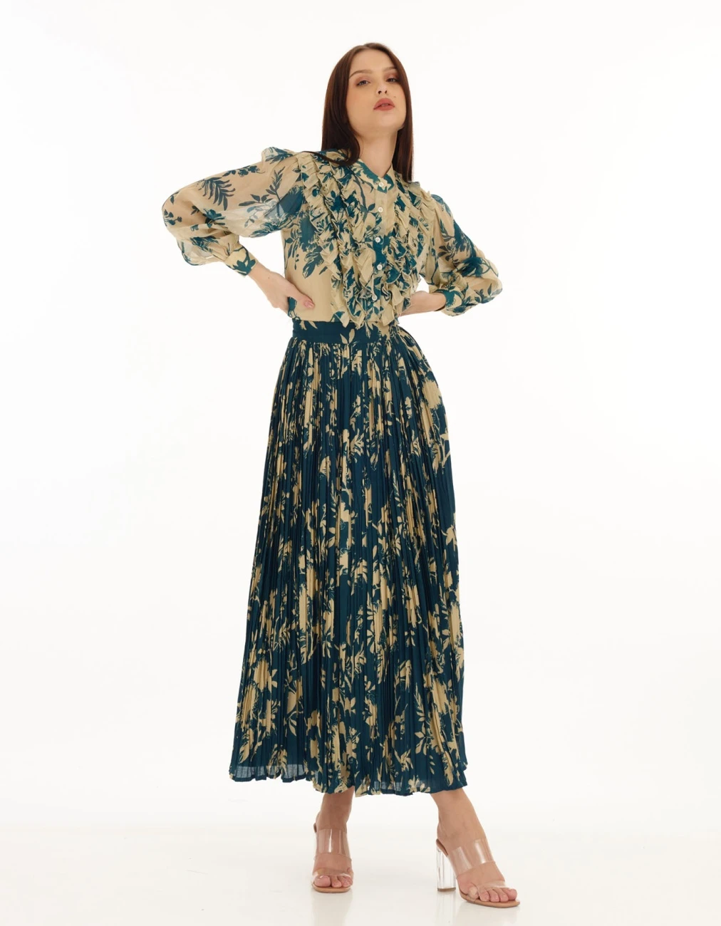 - Teal and Cream Floral Crinkled Skirt