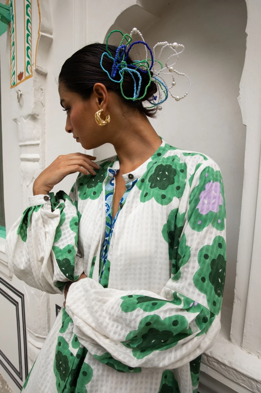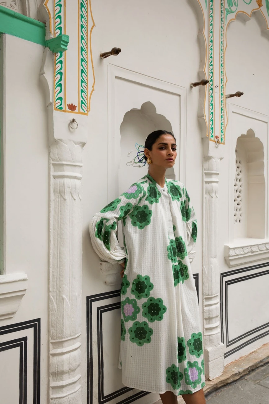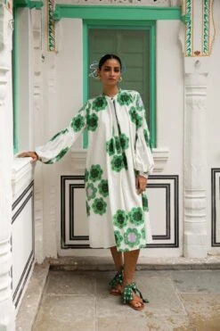 - Phool billowy dress has bracelet puffed sleeves and a central placket in contrasting fabric