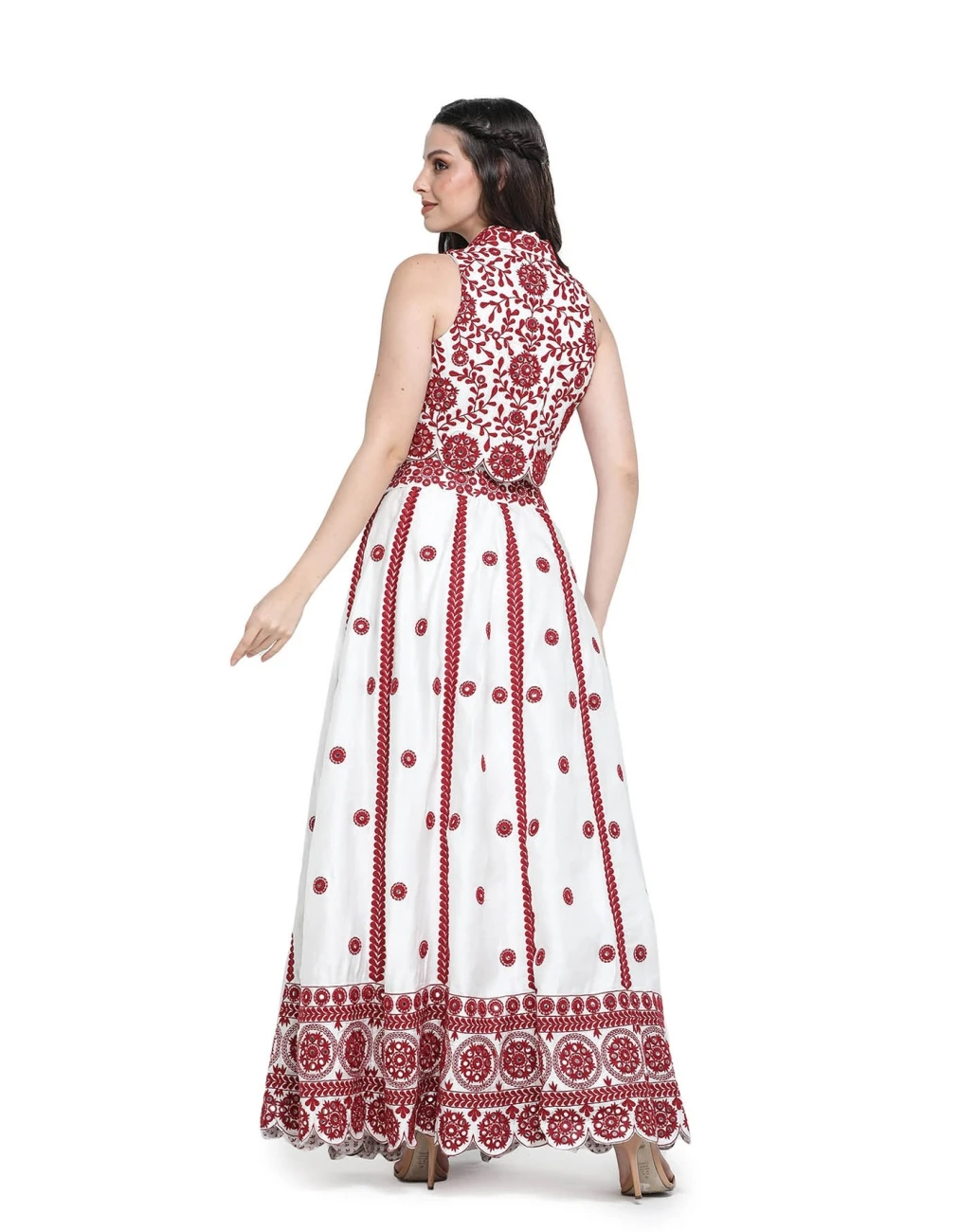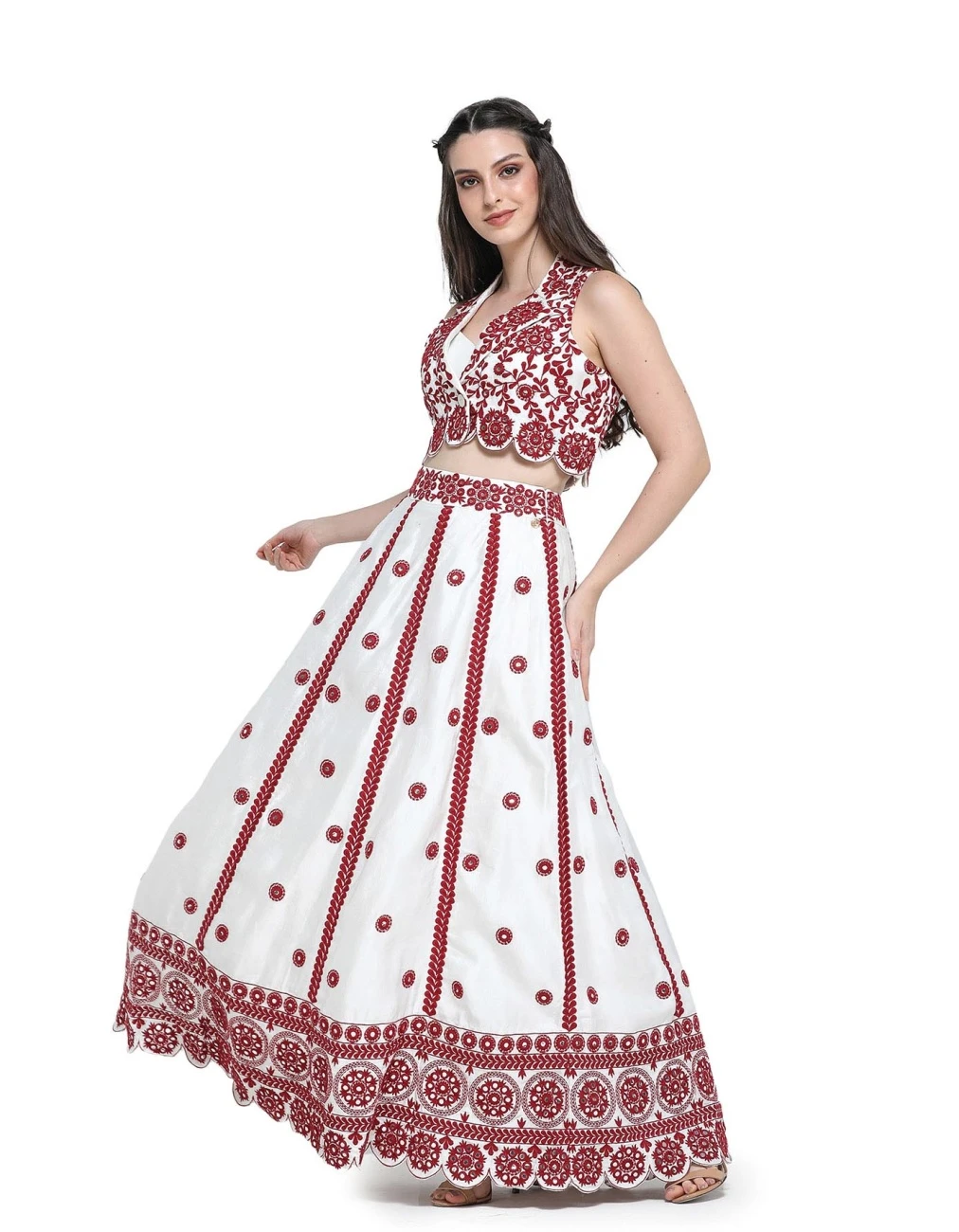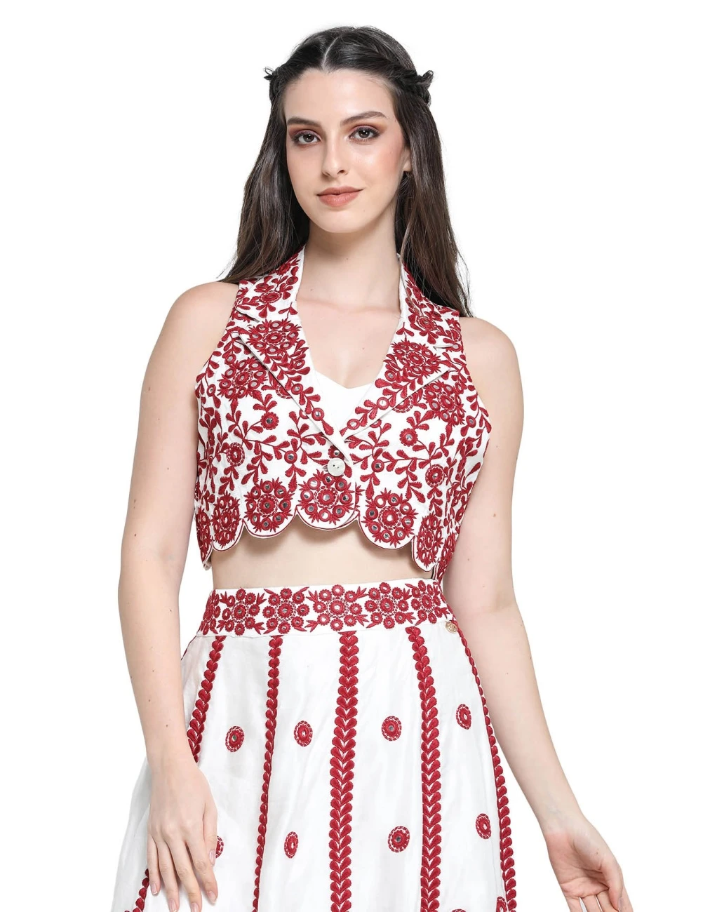 - White with red mirror embroidered skirt with embroidered crop jacket and white bustier