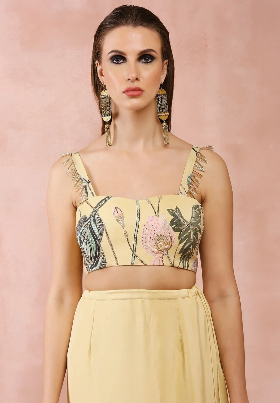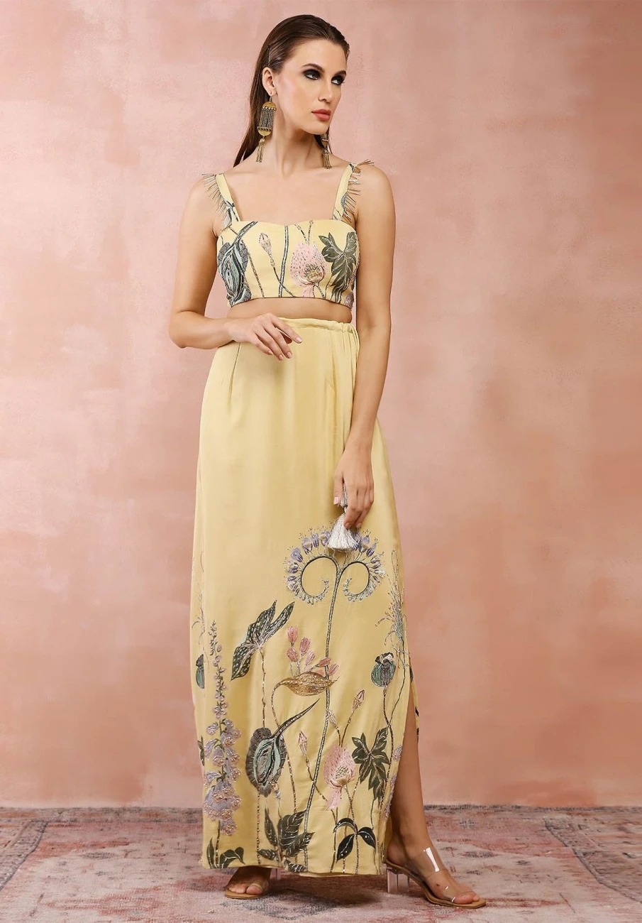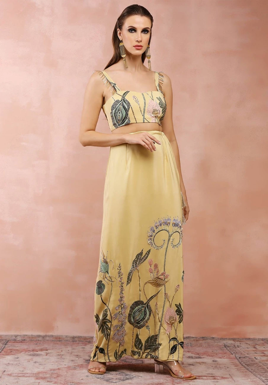- Yellow niloufar print crepe embroidered bustier with skirt