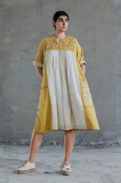 - Short yoke dress made with juxta positioning of handspun cotton and hand-block printed chanderi